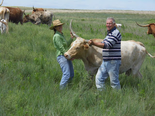 Texan cattle abound the mid-grass prairie and hosts Joe and Nancy Moore